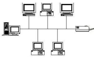 Topologi ini menggunakan satu kabel utama sebagai jalur komunikasi semua perangkat. Setiap komputer terhubung ke kabel tersebut.